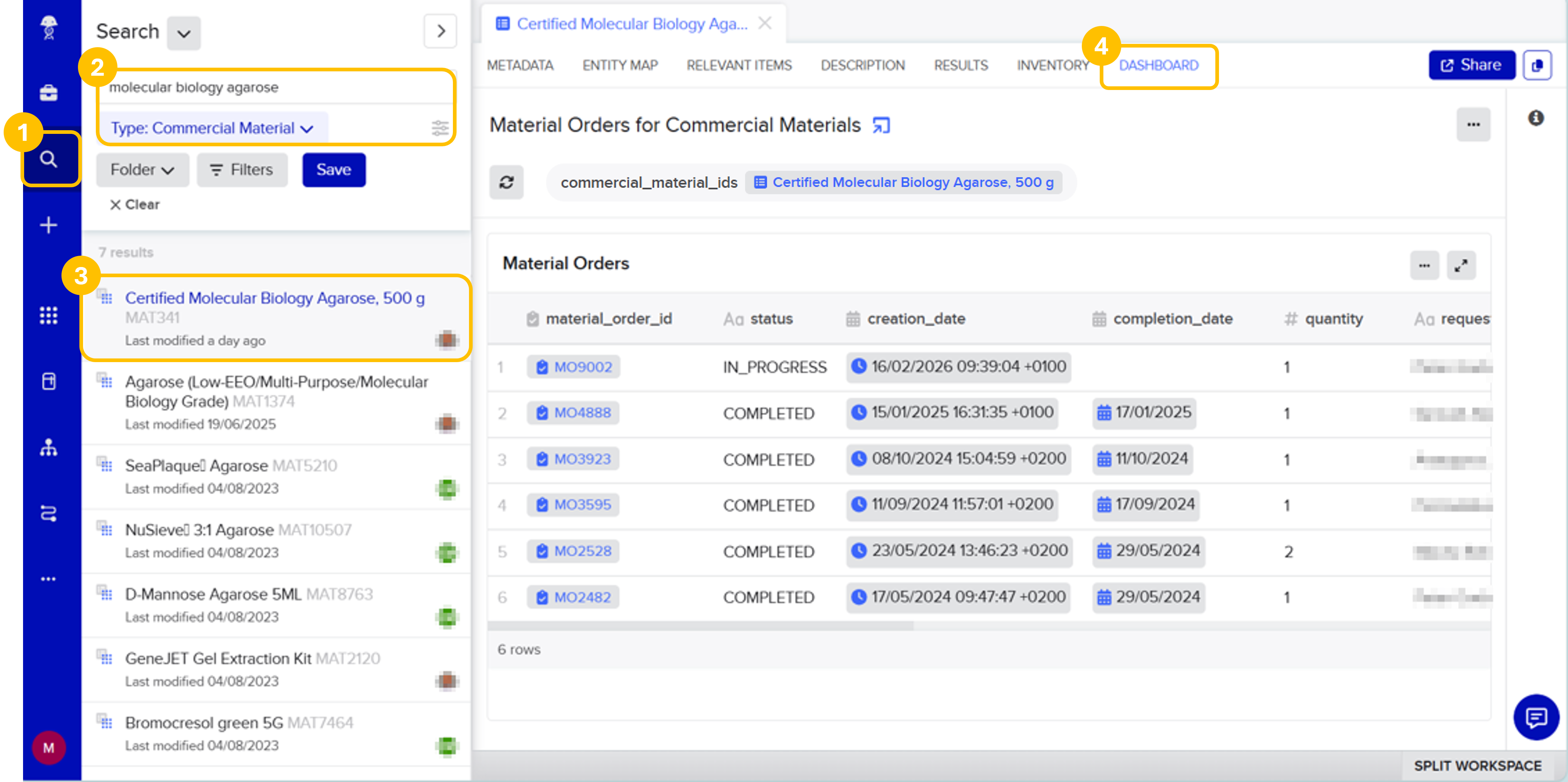 Click on the Dashboard tab. You will be able to see all past orders for the material. If no results are displayed, it means the material has not been previously ordered.