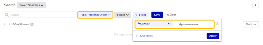 You can also do the search directly from the “Legacy Requests” Menu. Just remember to set the Type to Material Order so you can add the Requestor filter.