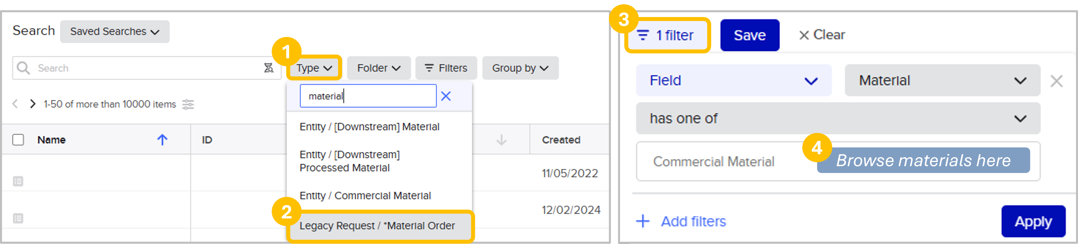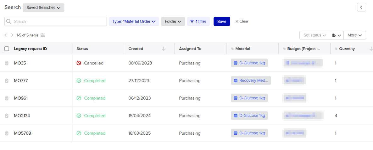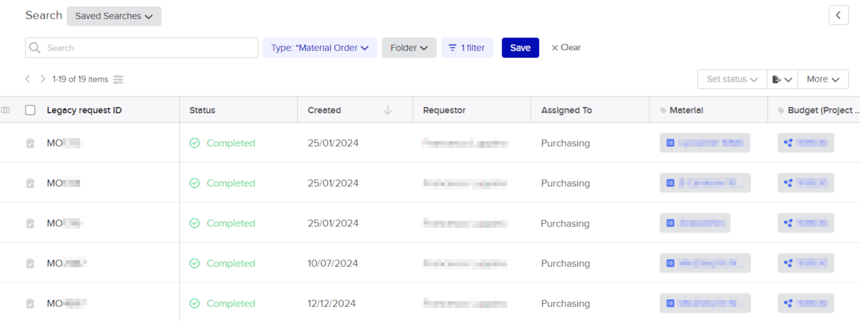 Once you click “Apply”, you will be able to see a list of all requests involving the selected materials, and you can sort by creation or completion date.