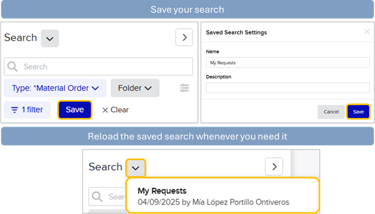 Save the search! Click on the Save button. This enables you to repeat the search of filters with fewer clicks in the future. You can find it in the “Saved Searches” Menu.