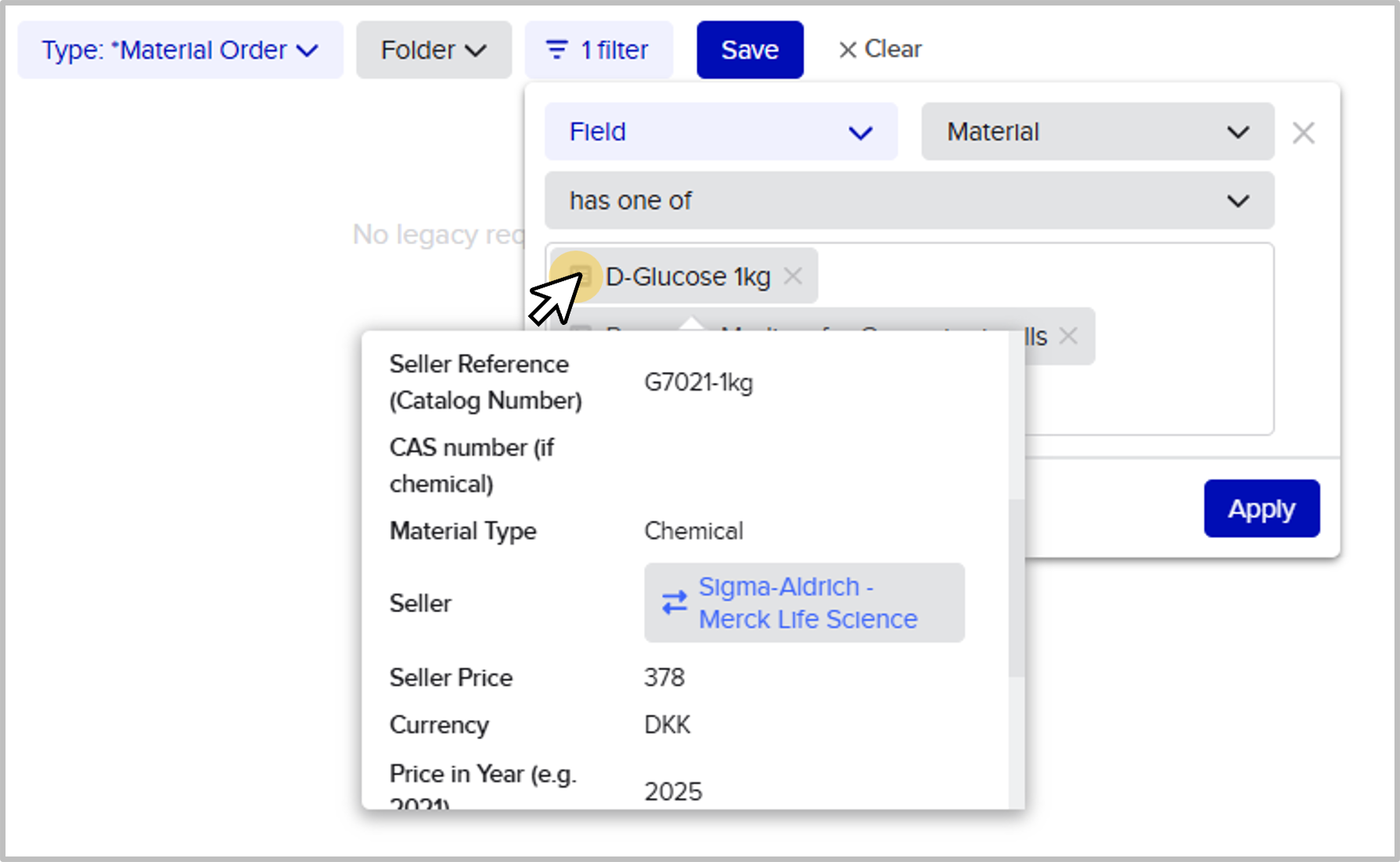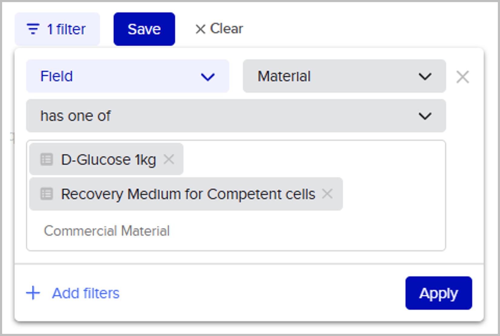 Filters: Field / Material / [Search for the material(s) you are interested in]