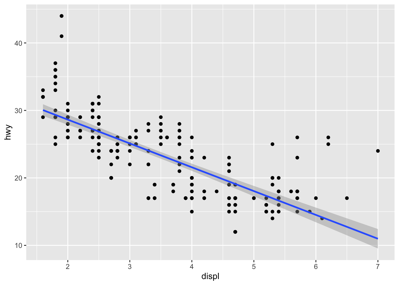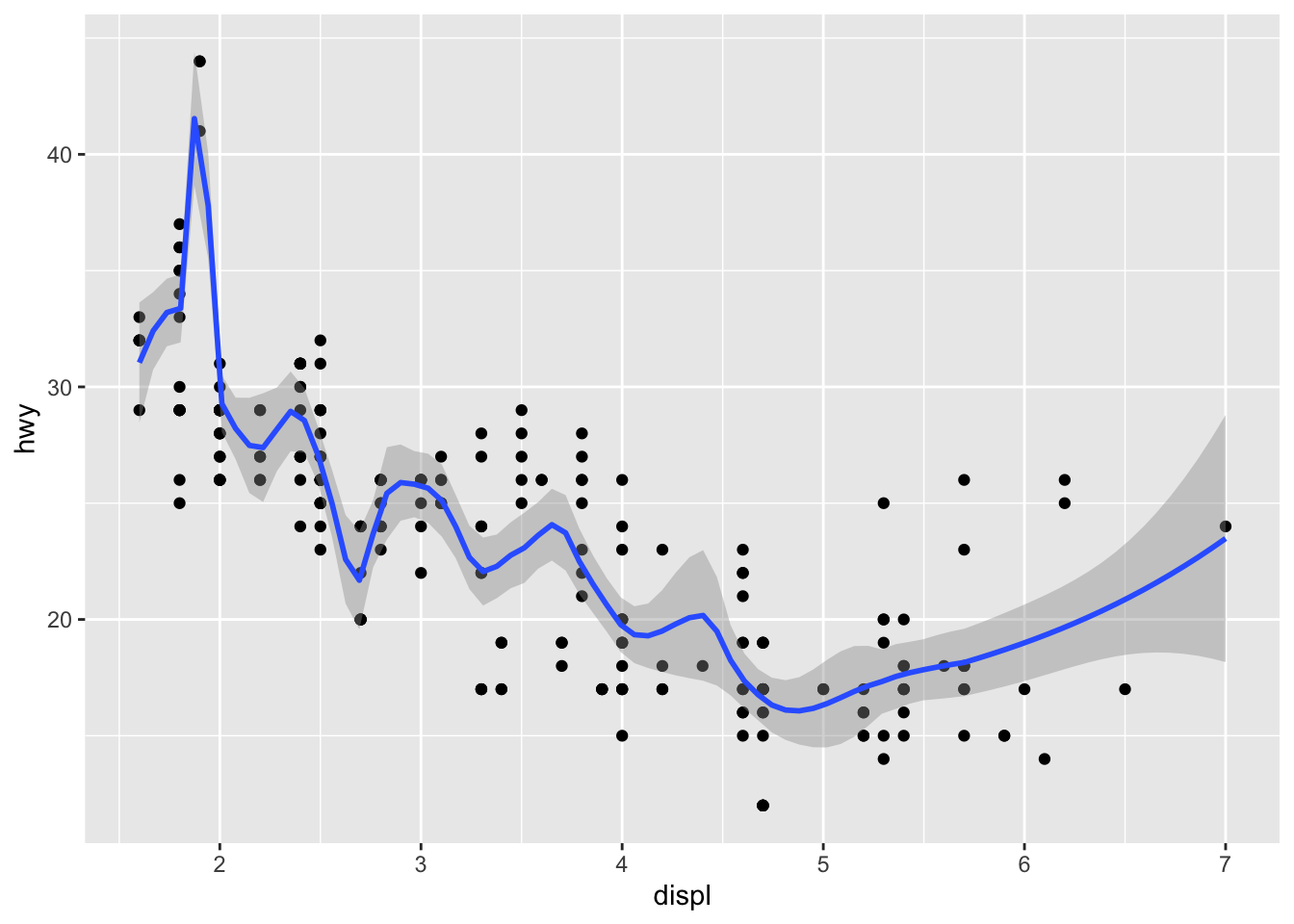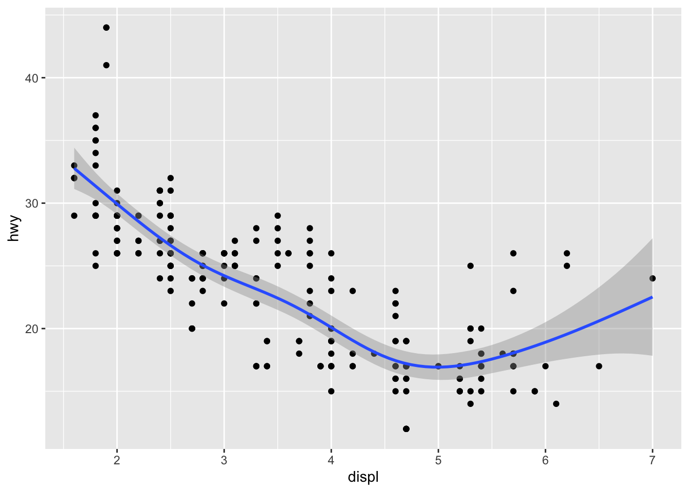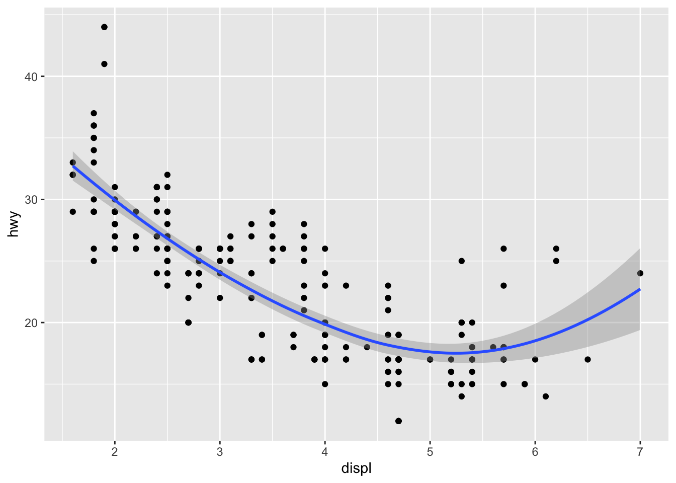 library(mgcv) ggplot(mpg, aes(displ, hwy)) + geom_point() + geom_smooth(method = "gam", formula = y ~ s(x))