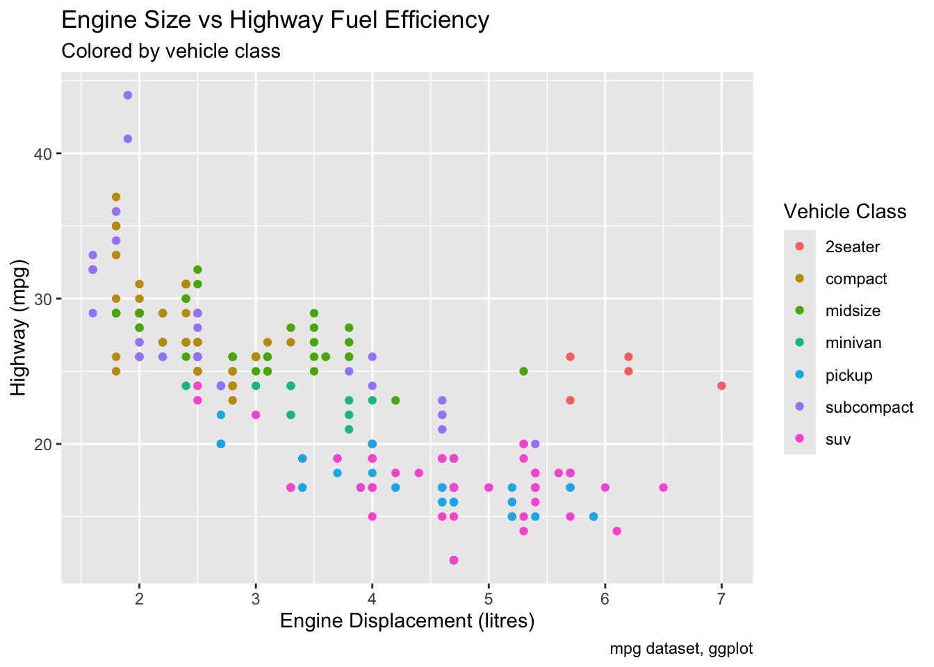 ggplot(mpg, aes(displ, hwy, color = class)) +