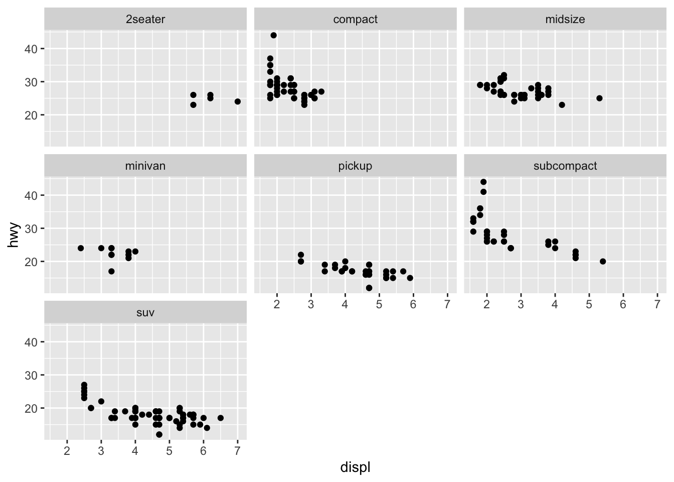 The facets have their own mapping that can be given as a formula. To plot subsets of the mpg dataset based on levels of the drv and year variables, we can use facet_grid() as follows: