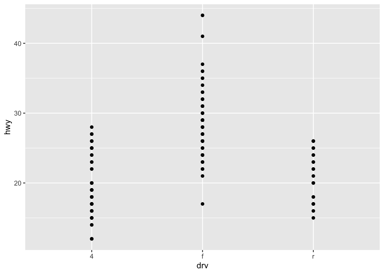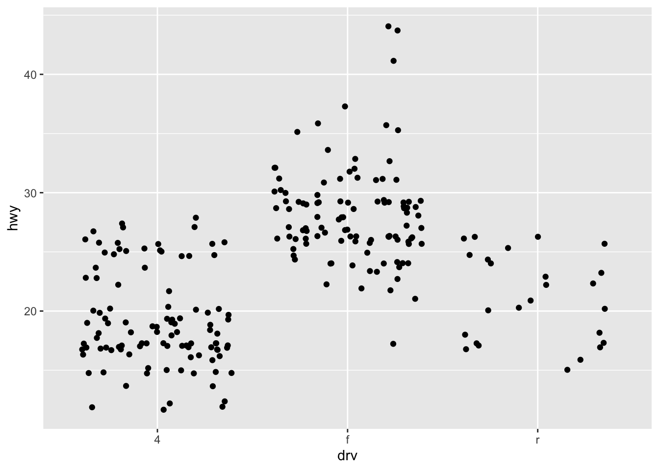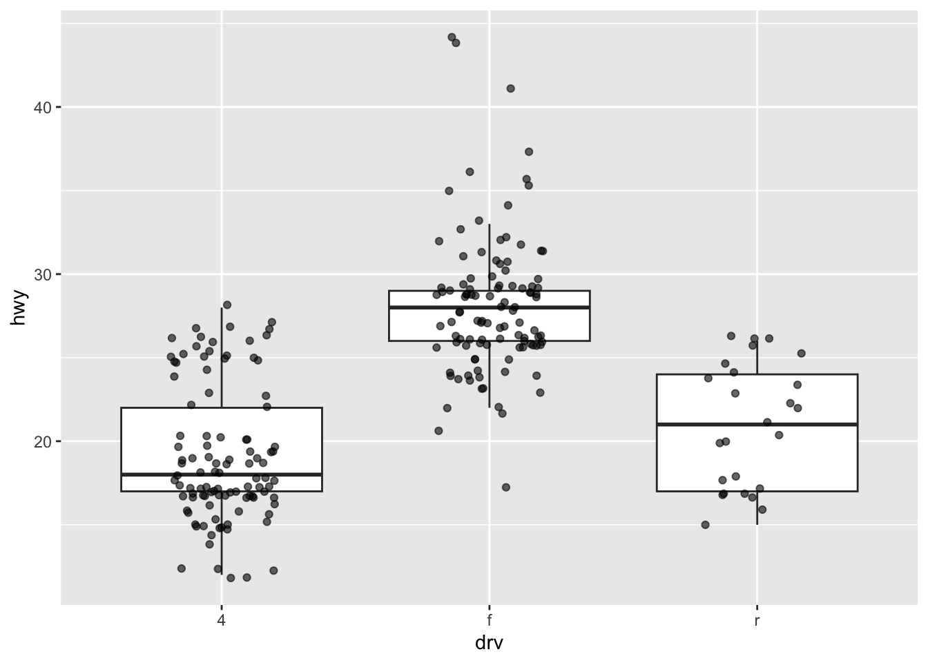 ggplot(mpg, aes(drv, hwy)) +